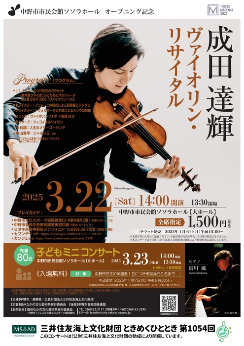 中野市/長野県/公益財団法人三井住友海上文化財団主催、中野市市民会館ソソラホールオープニング記念 三井住友海上文化財団 ときめくひととき 第1054回『成田達輝ヴァイオリン・リサイタル』が2025年3月22日 (土)に中野市市民会館ソソラホール 大ホール(長野県中野市三好町1-3-12)にて開催されます。