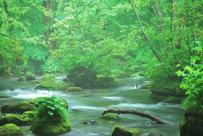 当ホテルの前を流れる奥入瀬渓流は、十和田八幡平(とわだはちまんたい)国立公園内に位置しており、国立公園の特別保護地区、天然記念物及び特別名勝に指定され、豊かな自然を有している場所です。例年、6月下旬からの約1か月間は梅雨の時期を迎え、湿った環境を好む苔や植物が一年で最も潤いに満ちる時期です。この時期の渓流に出かけると、草木は雨を含んで生き生きとし、木々の葉や苔も鮮やかな緑色に見えます。塵土(じんど)がすっきりと洗い流されたキラキラときらめく森と、潤いに満ちた渓流が織りなす幻想的な景色が見所です。