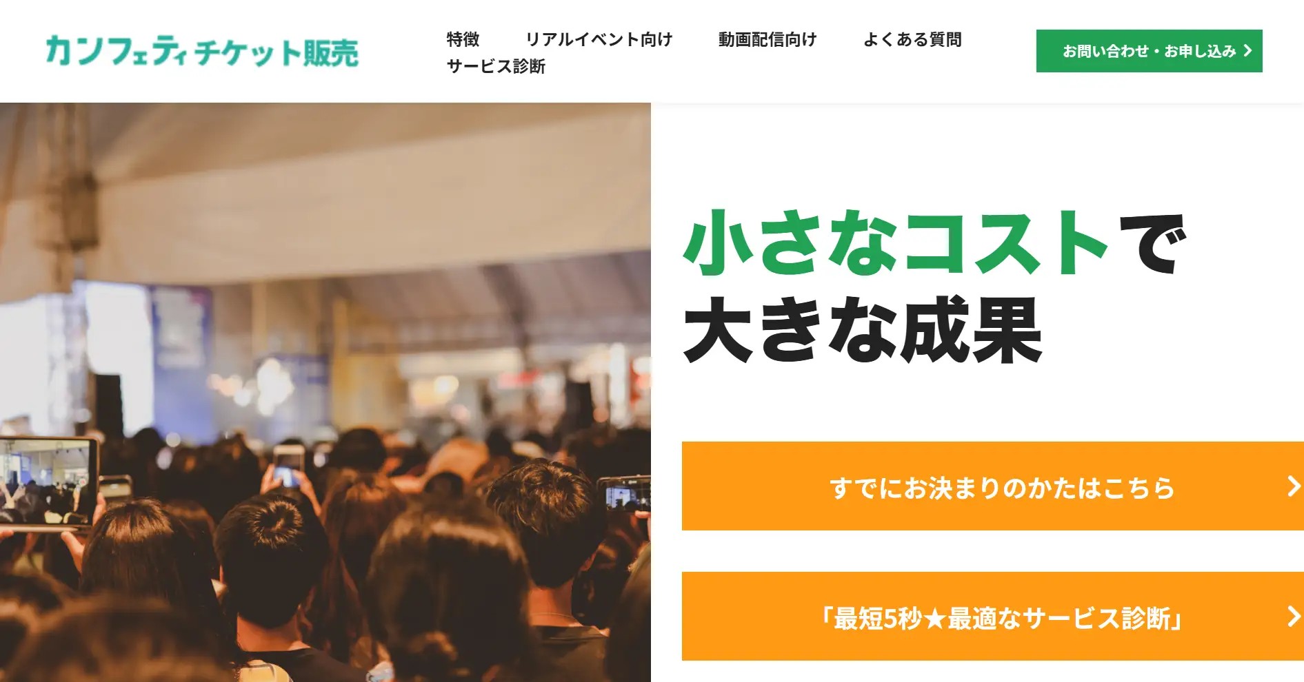 エンタメ好きが集うチケットサイト「カンフェティ」は、チケット販売を企画する主催者向けに、コンビニ発券、電子チケット、店舗販売、動画配信、電話受付など、最も効果的な販売プランを提供しています。チケット購入者には、チケット補償、託児無料、優待サービスなど実用的な特典が付くなど、チケットが「売れる」ための購入者ファーストを徹底しています。