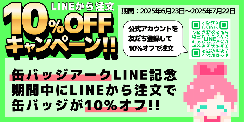 対象期間内に缶バッジアークのLINE公式アカウントからご注文いただくと、ご注文金額の合計から10%割引されます。