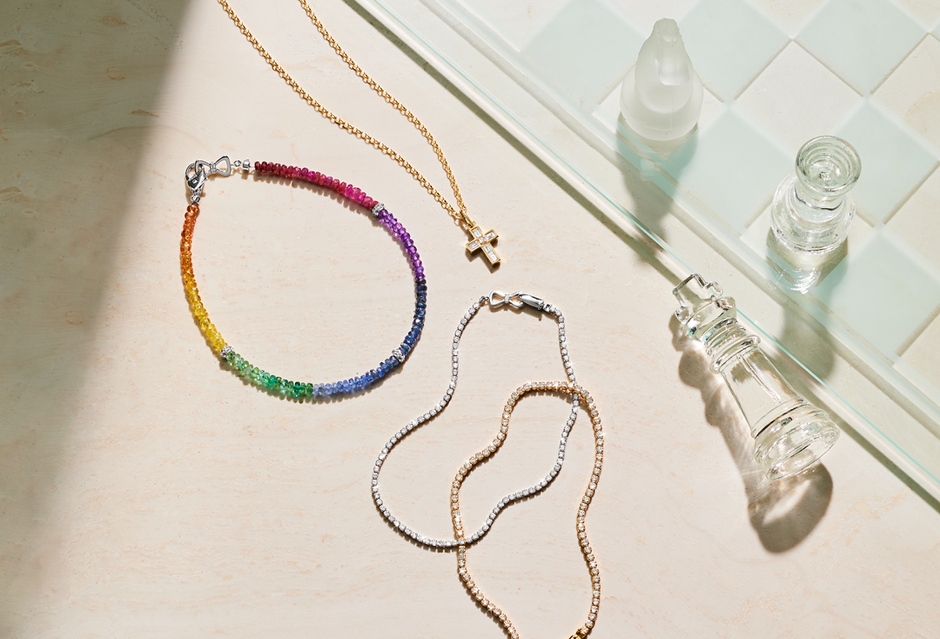 K18WG レインボーブレスレット/289,300円(税込)、PT900/1ctテニスブレスレット/499,400円(税込)、K18YG/2ctテニスブレスレット/819,500円(税込)、K18YG クロスネックレス/199,100円(税込)、K18YG チェーンネックレス/113,300円(税込)
