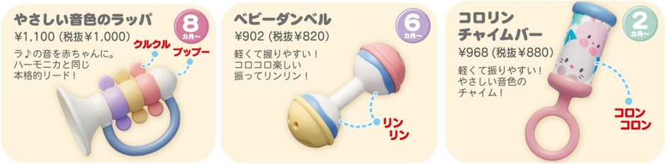 「洗えるラトルシリーズ」は、発売に合わせて店頭で「洗える」ことを訴求し展開したところ、従来の1.5倍に売り上げが増加しました。また、本製品はなんでも舐める・口に入れる赤ちゃんの行動を意識し「無塗装」にすることで塗装が剥がれる心配がなく遊ぶことができます。また、万が一想定して「ネジ不使用」で超音波の接着方法にすることで、赤ちゃんに「やさしい」安心設計が実現しました。