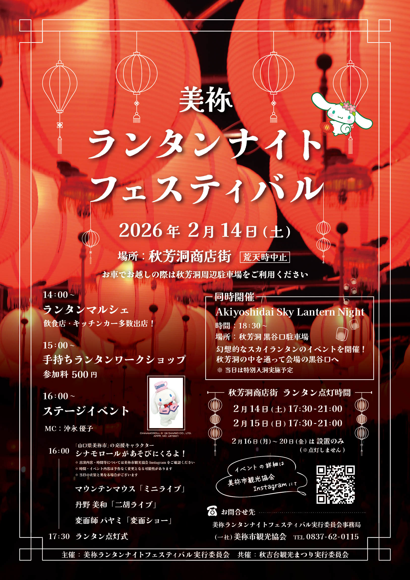 美祢ランタンナイトフェスティバル実行委員会及び秋吉台観光まつり実行委員会(事務局:一般社団法人美祢市観光協会)は、美祢市の秋吉台地域の活性化を目的としたイベント「美祢ランタンナイトフェスティバル」を2月14日メインとし、2月14日・15日の2日間、開催いたします。14日は「Akiyoshidai Sky Lantern Night」も開催します。