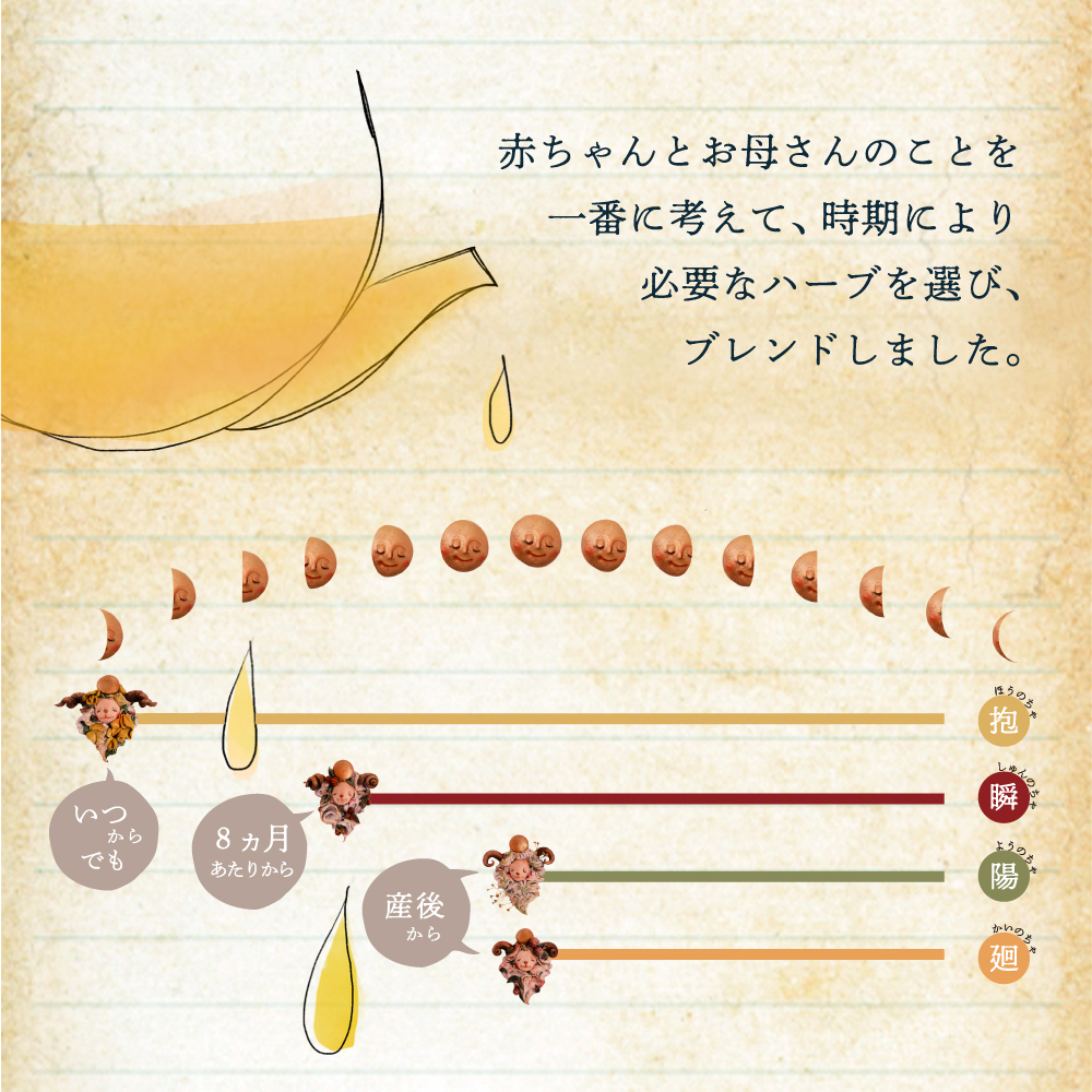 「月羊母茶(つきのよもちゃ)」は、妊娠初期・妊娠後期・産後(授乳期)といった女性の体調の変化に合わせて飲める4種類のマタニティーブレンドティーです。