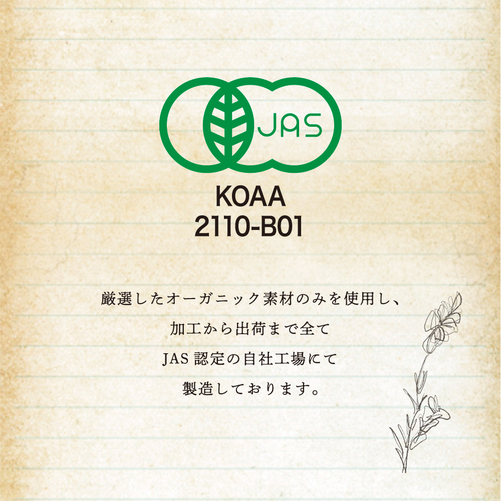 すべてノンカフェイン。オーガニック素材100%を使用し、JAS認定工場で丁寧に製造しています。