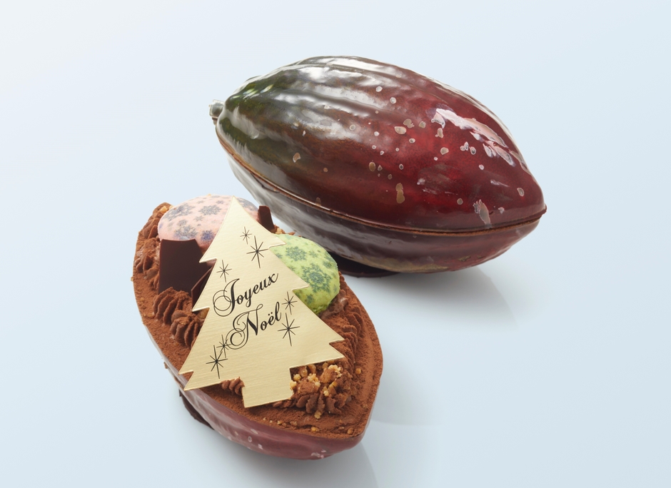 カカオの型の器をチョコレートでつくり、シェフが一つひとつ手作業でカカオの模様を描きました。中はチョコレートムース、オレンジジュレやバナナガナッシュなどを重ねて7層に。味の奥行と調和を楽しめるガトーは、聖夜にふさわしい美しいクリスマスケーキです。