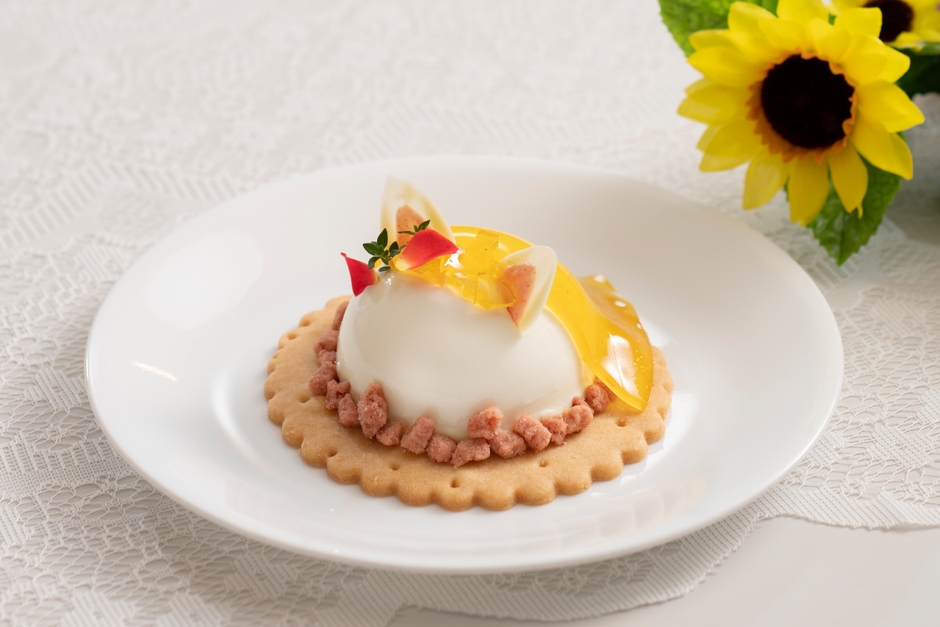 いちごムースのピンク色をベースに、耳とカチューシャをイメージしたクリームでダルシネアのかわいらしさを表現し、8月の誕生花である“ひまわり”のクッキーをデコレーションしました。夏らしいパッションフルーツジャムや炭酸レモンジュレの爽やかな味わいなど、食べ進めるごとに様々な風味をお楽しみいただけます。