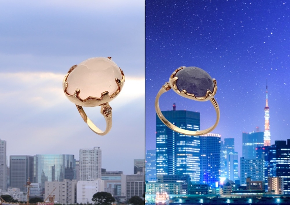 1日の始まりを告げる朝焼けの空をローズクオーツで、気持ちが華やぐような春の夜空をタンザナイトで表現しています。石はどちらもプラネタリウムを連想するドーム状のカボションカットを使用して引っ掛かりを抑えました。ふと見上げた空を取り囲むように街の景色がシルエットとなり日常の1シーンから始まるドラマがリングになるジュエリーです。