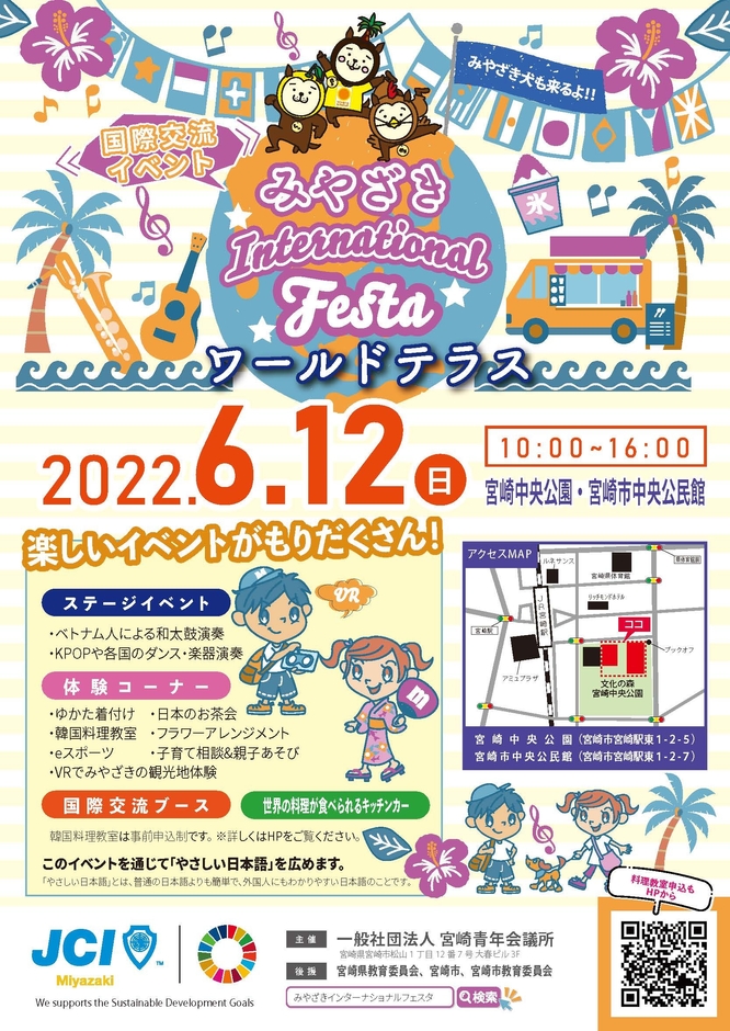 みやざきインターナショナルフェスタ~ワールドテラス~は一般社団法人宮崎青年会議所主催の、宮崎市民と外国人とのコミュニケーションを促進し、共助しやすい地域コミュニティを形成することを目的にした国際交流イベントです。