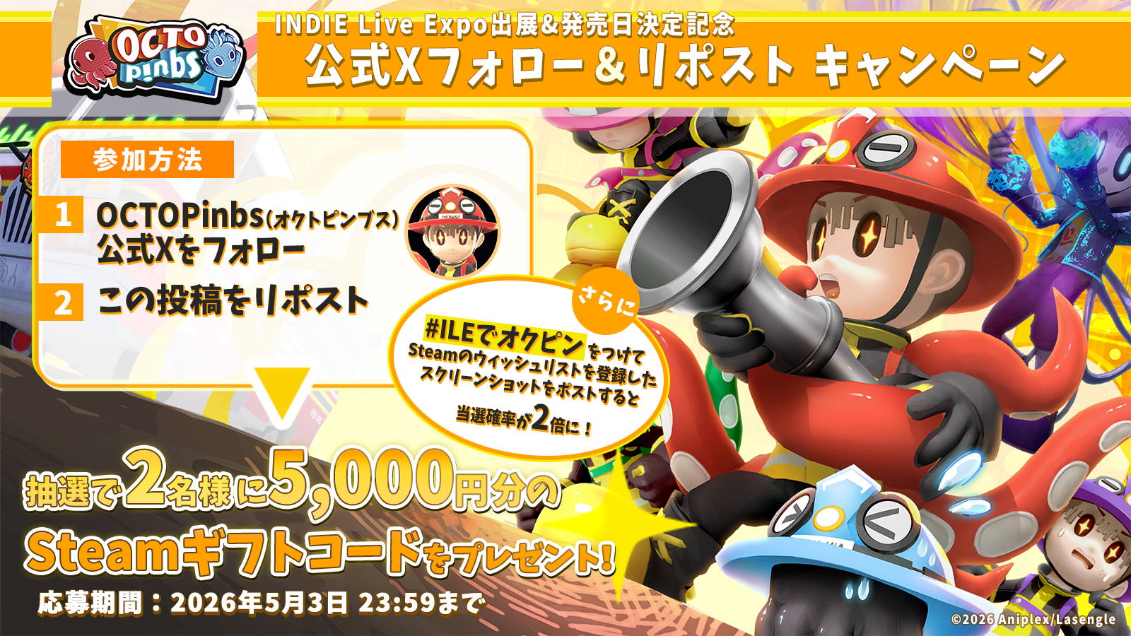 株式会社アニプレックス(本社:東京都千代田区 代表取締役 西本修 以下アニプレックス)は、本日開催されたINDIE Live Expoにてオンラインマルチプレイアクションゲーム『OCTOPinbs(オクトピンブス)』をSteam®にて2026年5月12日(火)に発売することを発表いたしました。