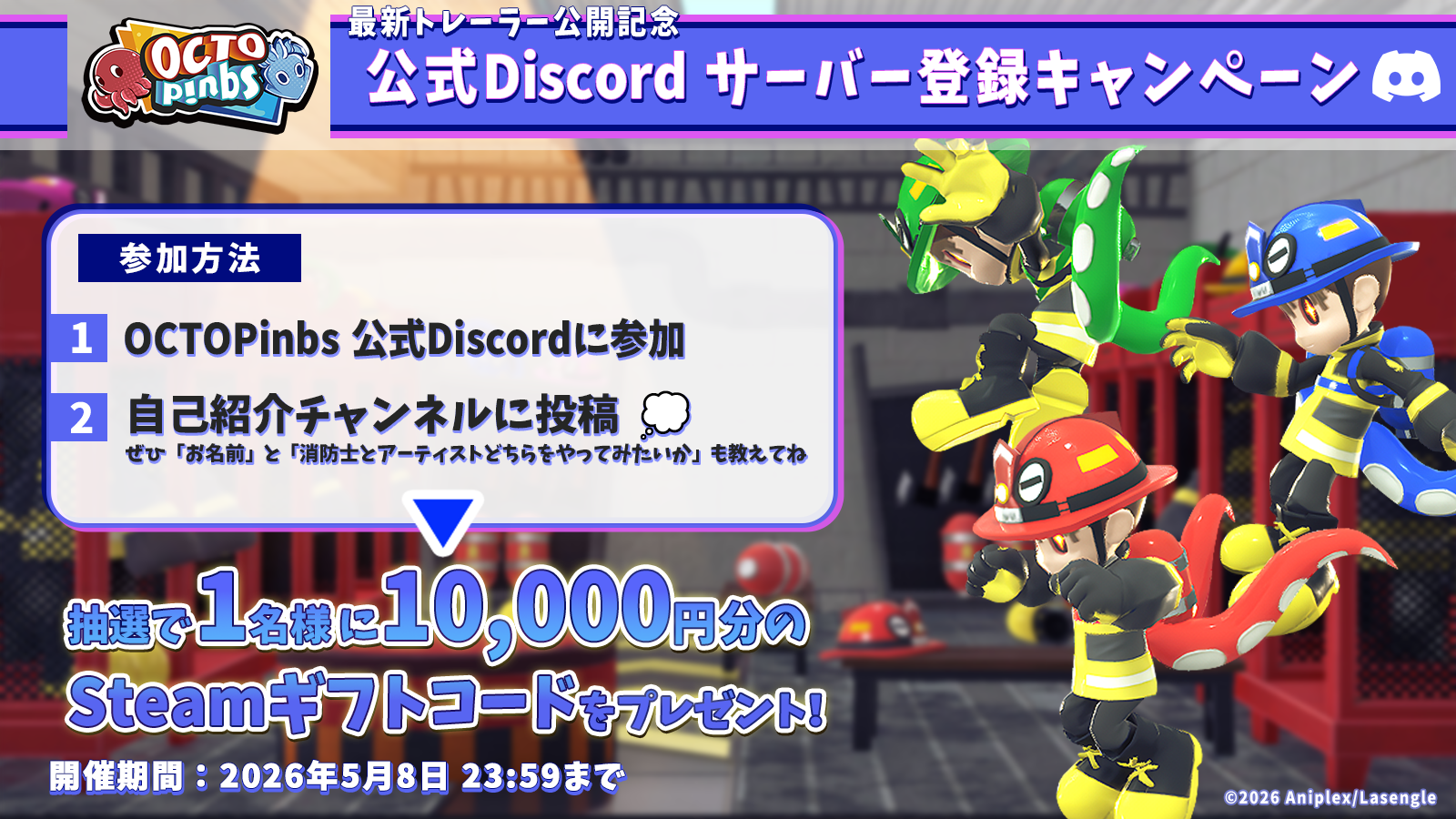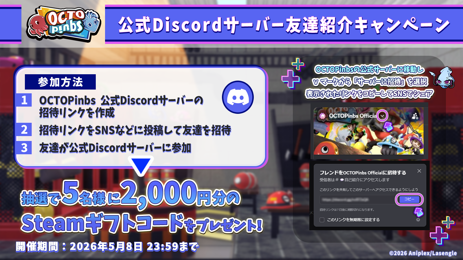 『OCTOPinbs』公式XとDiscordにて抽選でSteamギフトコードが当たるプレゼントキャンペーンを3件実施いたします。