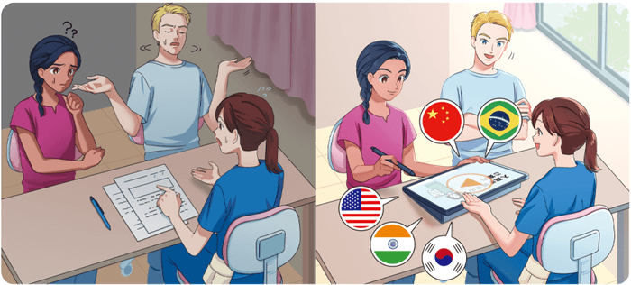 外国人患者への説明も、準備や翻訳の手間なく実施可能です。