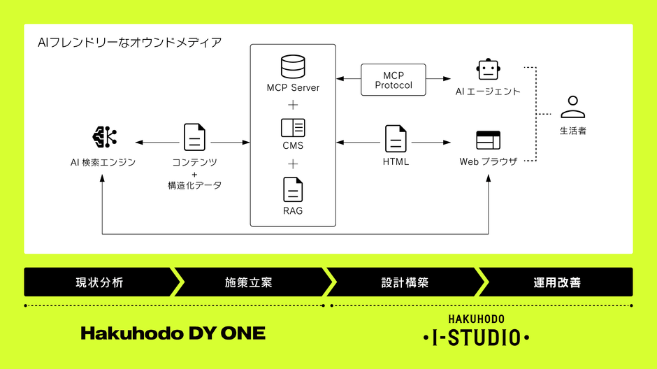 株式会社 博報堂アイ・スタジオ(本社:東京都千代田区、代表取締役社長 兼CEO 兼CCO:川又 昌弘、以下、博報堂アイ・スタジオ)と株式会社Hakuhodo DY ONE(本社:東京都港区、代表取締役会長:田中 雄三 代表取締役社長:小坂 洋人、以下、Hakuhodo DY ONE)は、AIフレンドリーなオウンドメディア構築ソリューションの提供を開始することをお知らせいたします。