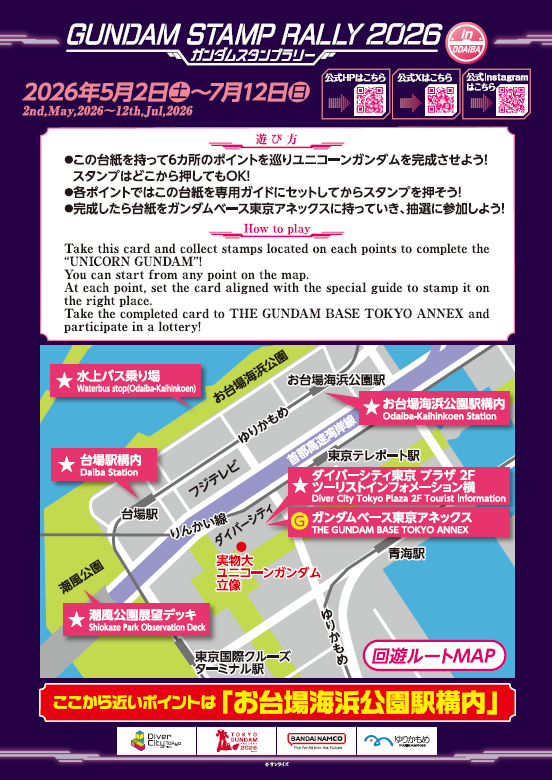<TOKYOガンダムプロジェクト2026> 臨海副都心エリアにて"ガンダムスタンプラリー2026"開催! 第一弾は、2026年5月2日(土)~6月7日(日) 完成者には抽選でガンダムベース限定 ガンプラ・オリジナルグッズが当たる! 5月初旬からは高校生による英語観光ガイド "English Guide"も開催!