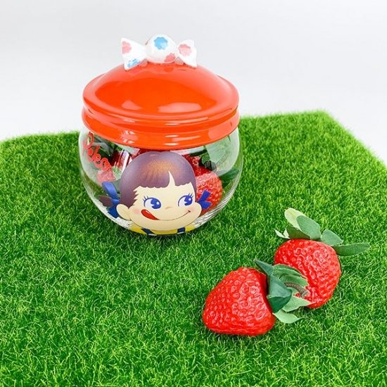 ガラスのポットにお馴染みのペコちゃんの顔がデザインされていて、赤いフタにはミルキーのフィギュアも♡