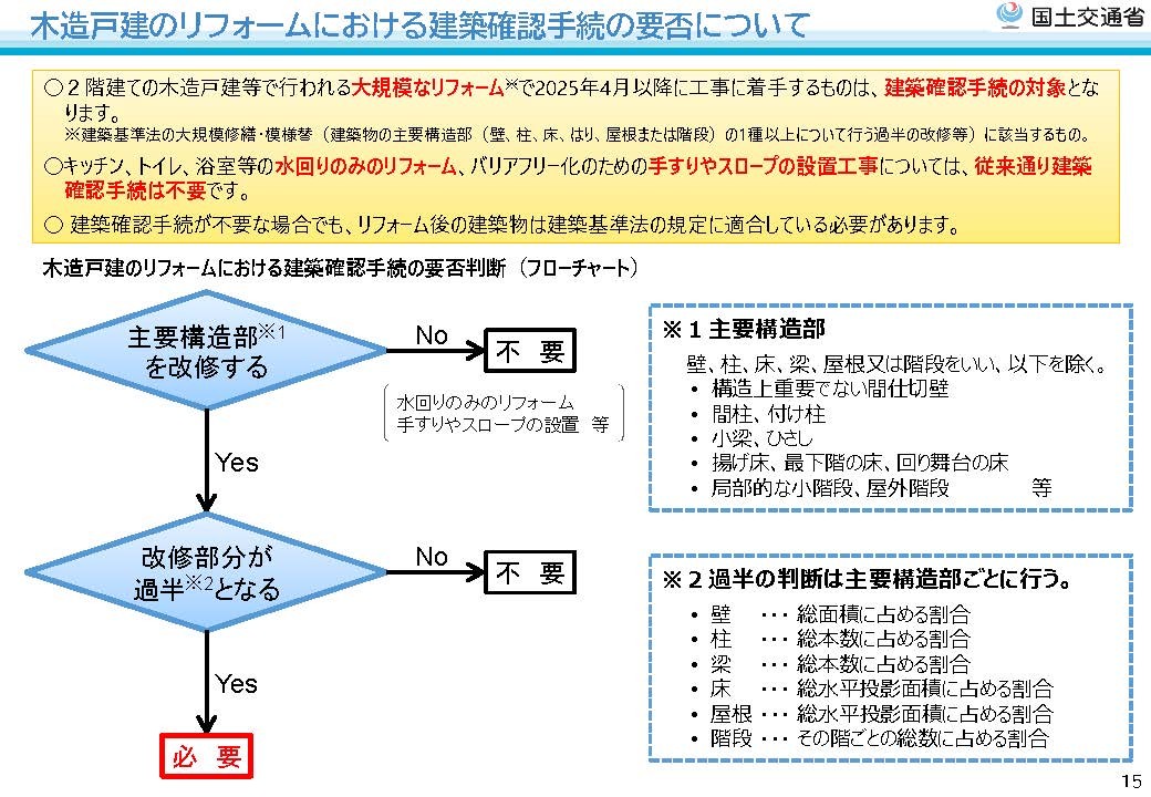 国土交通省住宅局「木造戸建の大規模なリフォームに関する建築確認手続について【令和7年2月21日時点】」