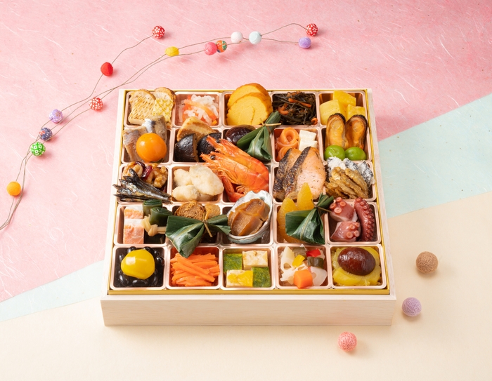 帆立香草焼/いか黄金焼/京風なます/伊達巻/松前漬/さつま芋甘煮/にしんコンフィ/金柑/豚角煮 オレンジソース/椎茸煮/紫花豆綾煮/牛肉笹包/スモークサーモントラウト/クリームチーズの粕漬/パーナ貝燻製/若桃甘露煮/クランベリーくるみ/田作り煮/真鱈の南蛮漬/えび香草焼/サーモントラウト香草焼/こはだ卯の花和え/ワカサギ甘煮/鱒蒲鉾/昆布巻/子持鮎甘露煮/あわび煮/数の子/真だこ酢煮/黒豆ワイン煮/栗甘露煮/キャロットラぺ/いか東寺焼/海鮮しんじょ/蓮根ピクルス/きんとん/渋皮栗甘露煮