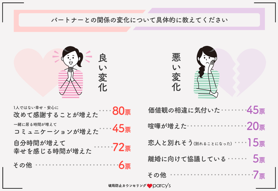いずれにせよこれまでのお互いの距離が変わったことで、「価値観の相違に気づいた」と回答する人は45人にまでのぼりました。