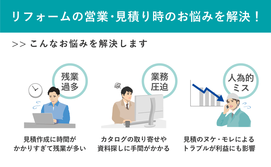 住宅リフォーム市場は持続的な需要がある一方で、営業現場の労働長時間化が深刻な課題となっています。従来のリフォーム営業では、現場調査後に一度帰社し、採寸データを元に積算、カタログを確認しながら見積を作成するというプロセスが一般的でした。
