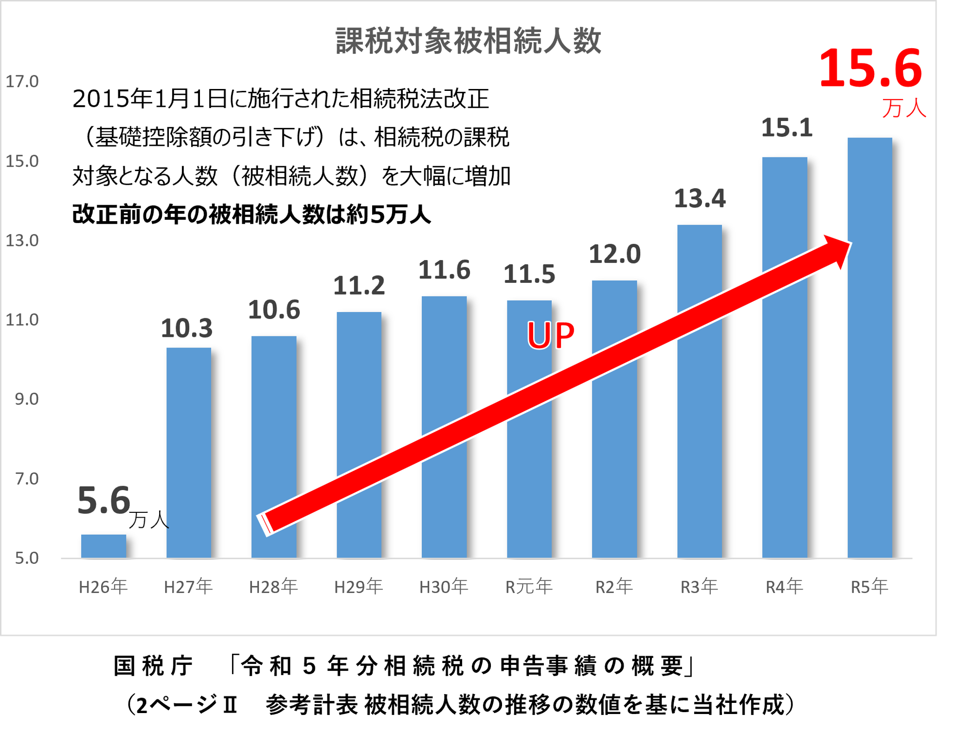 相続税の申告書提出に係る被相続人の数(相続税の課税対象となった故人の数)は増加傾向にあり、2015年まで5万人前後だったものが、2023年には15.6万人となっています。