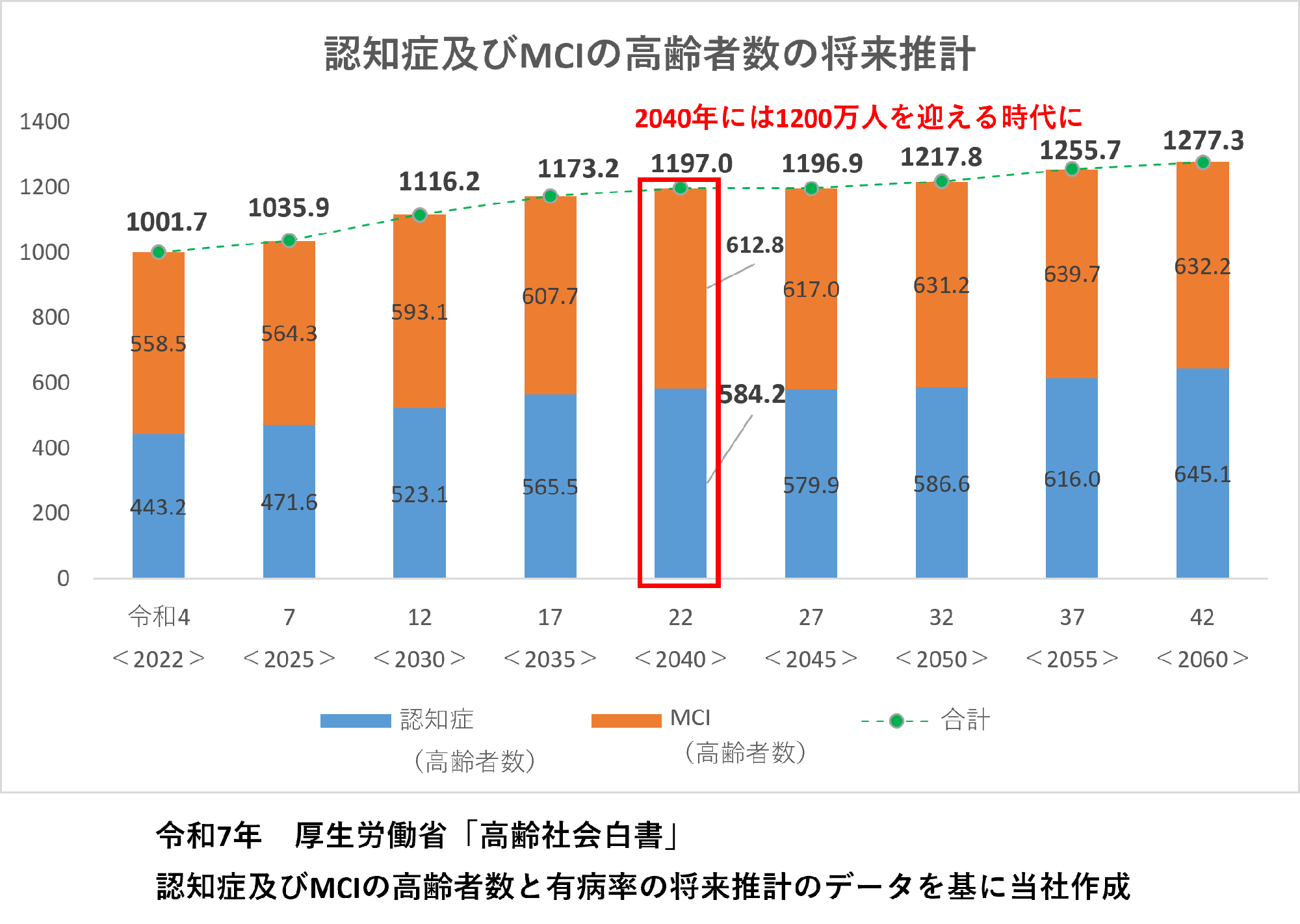 さらに、軽度認知障害(MCI)の高齢者も含めた認知症またはその予備群の総数は、2040年には約1,200万人に膨れ上がり、高齢者の約3.3人に1人が認知症又はその予備群となる時代が到来*します。
