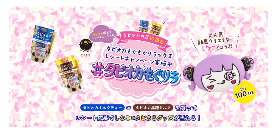 デザート、ヨーグルト、チルド飲料の事業を展開している安曇野食品工房株式会社(本部:東京都中央区、代表取締役社長:大谷 俊介)は、2025年11月9日に迎える「タピオカの日10周年」を記念し、人気の原宿系動画クリエイター しなこさんとコラボレーションした「#タピオカもぐリラ レシートキャンペーン」を開催しています。