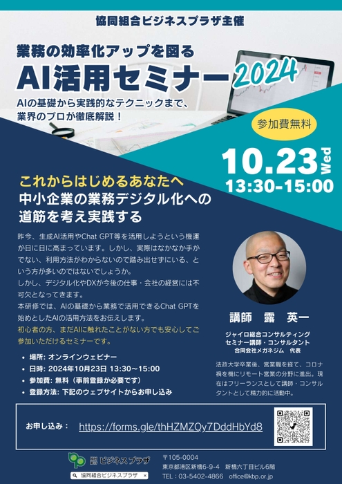 協同組合ビジネスプラザ(東京都港区)は生成AIの初心者向けに、AIの基礎から業務で活用できるChat GPTをはじめとしたAIの活用方法を解説するウェビナーを2024年10月23日(水)に開催いたします。まだAIに触れたことがない方、なんとなくAIに対して苦手意識を持っている方でも安心してご参加いただけるセミナーです。