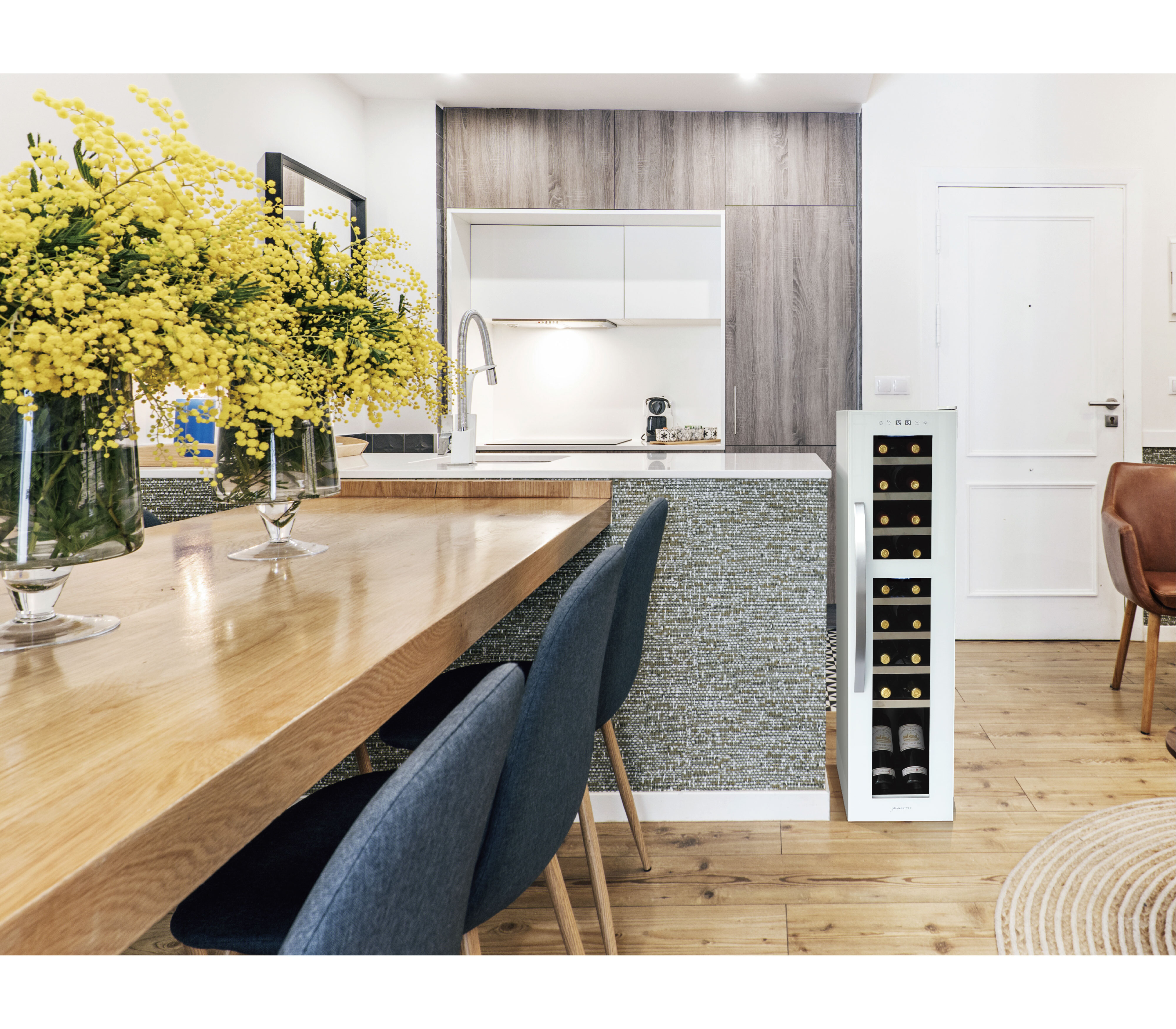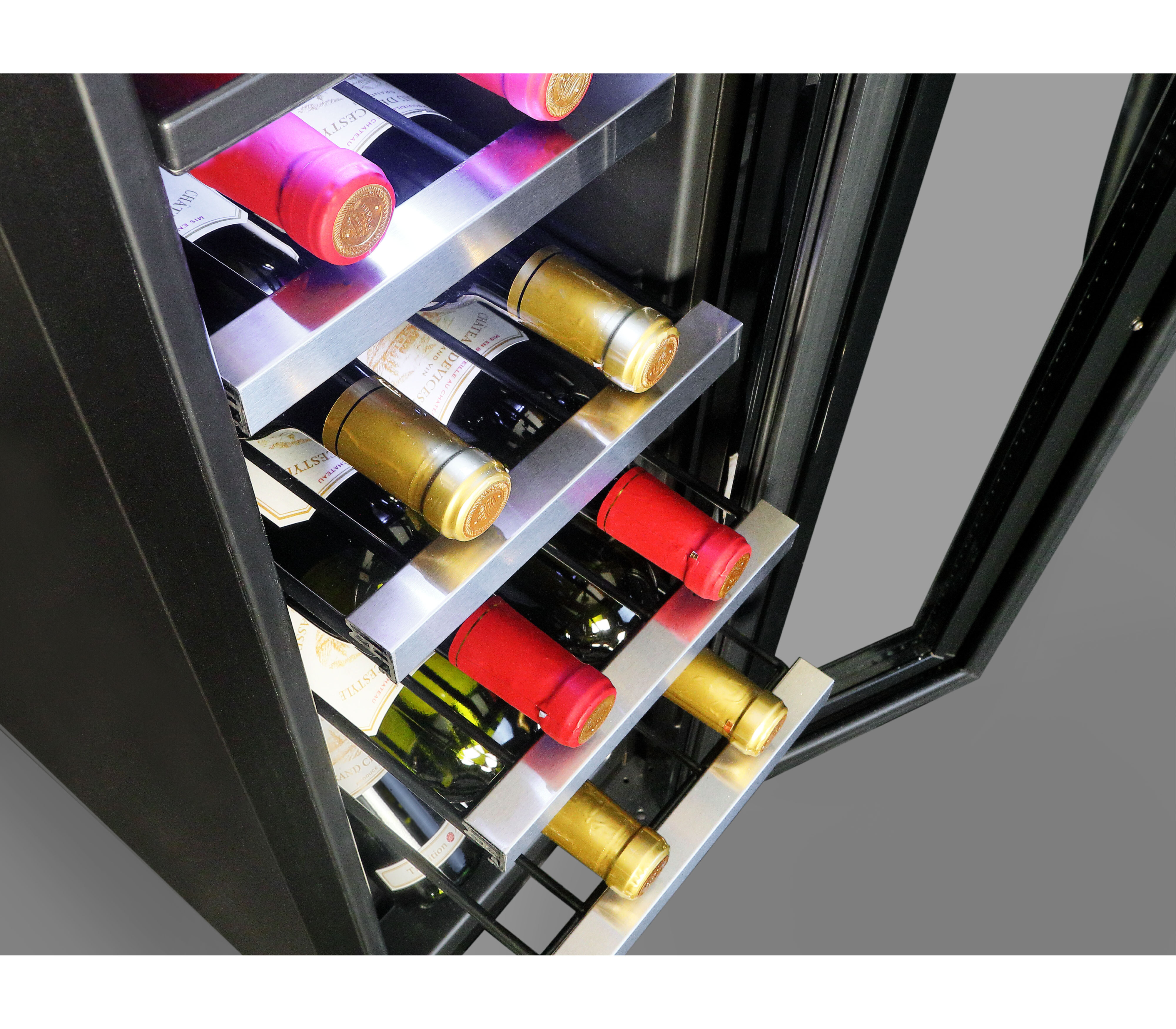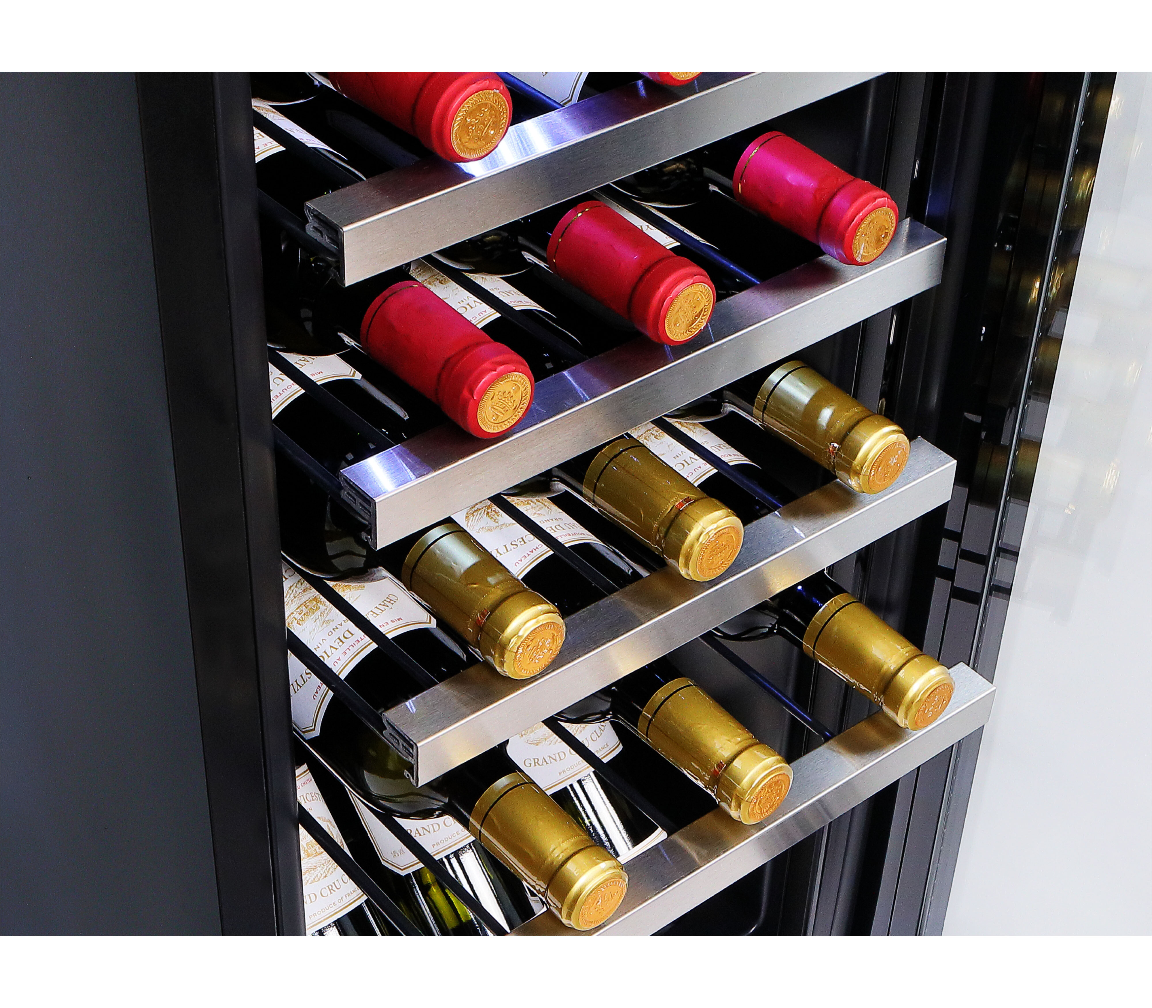 ちょっとしたすき間にも据え付け可能な幅わずか290mmのスリムボディ。ブルゴーニュタイプのボトルも収納可能な余裕の棚ピッチ90mm。