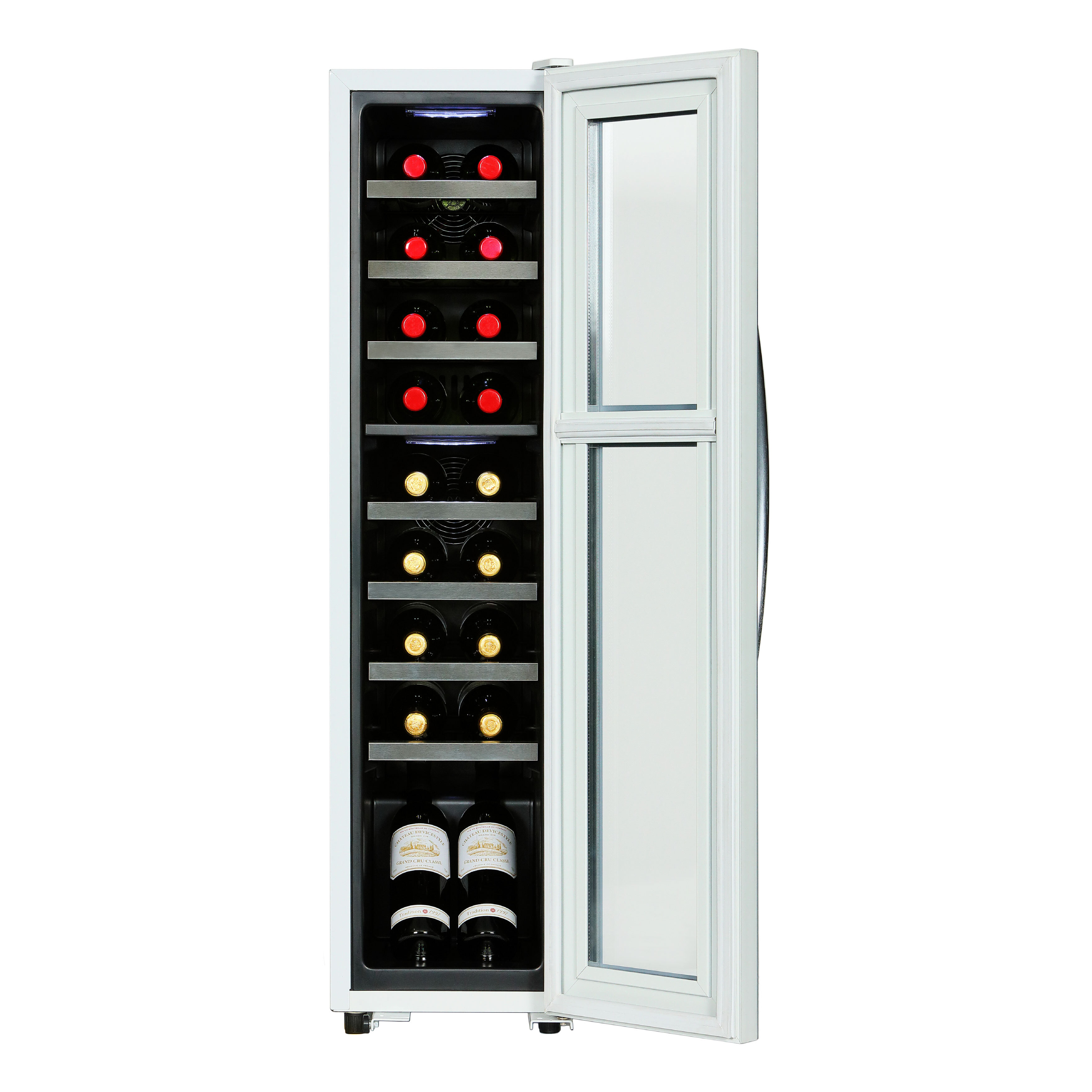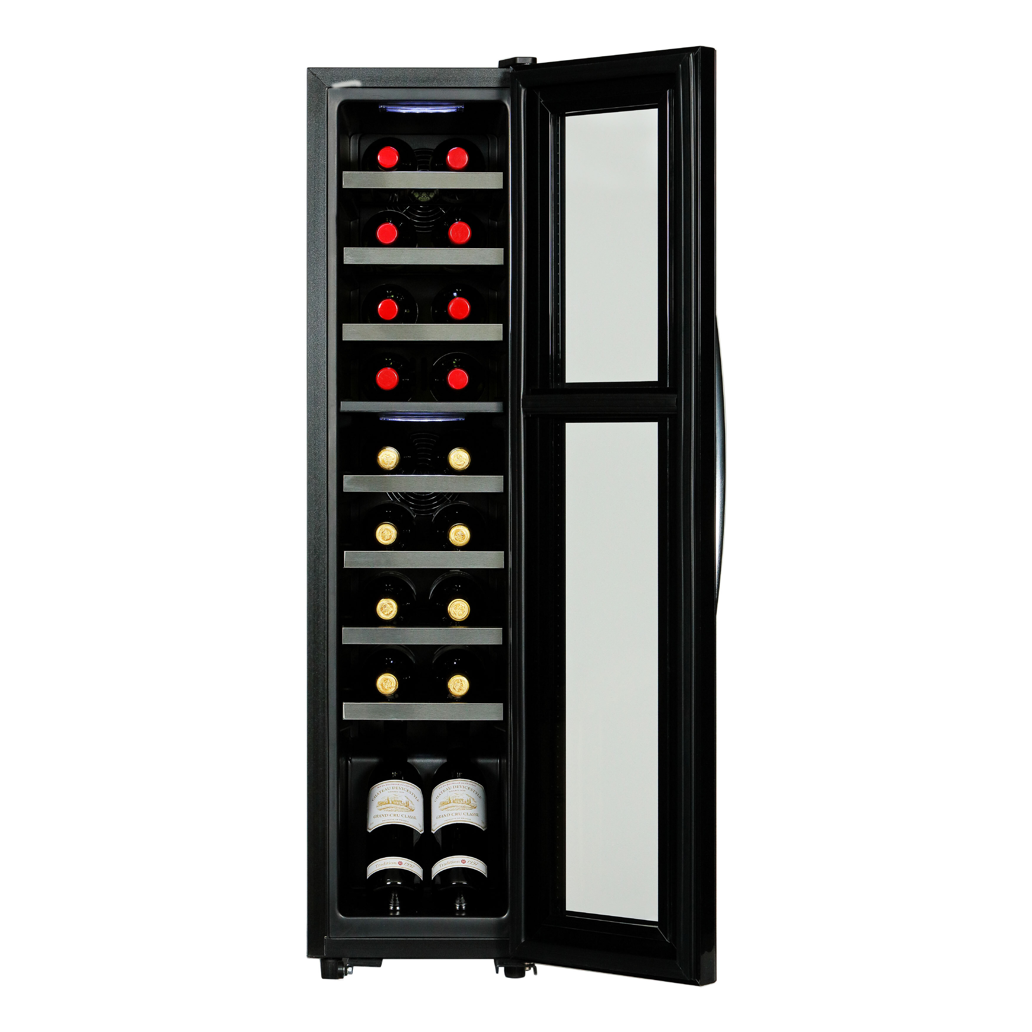 『DCG-C18S』は上部庫内および下部庫内の完全独立制御を実現。上下庫内ともワインに適切な5~20℃の温度帯でそれぞれ設定可能です。横幅わずか290mm*3のスリムボディですので、据付場所を選びません。