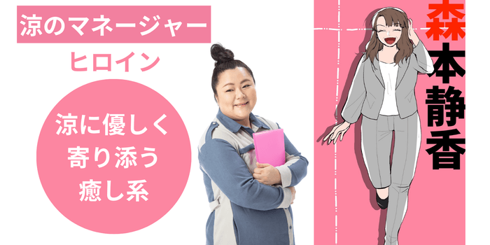そんな涼を献身的にサポートするマネージャー、ヒロイン森本静香は、波動シンガーとしても注目されるSIZUKUが演じる。