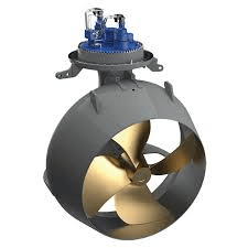 アジマススラスターは、船舶の推進および操船を担う可動式推進装置であり、港湾作業船、フェリー、海洋調査船、海上プラットフォーム支援船などに搭載される。推進器を水平方向に回転させることで、前後進だけでなく横方向への移動や定点保持を可能とし、狭水域での離着岸作業や洋上作業時の位置保持に活用される。タグボートやオフショア支援船では、高い操縦性が求められる場面で重要な役割を果たす。