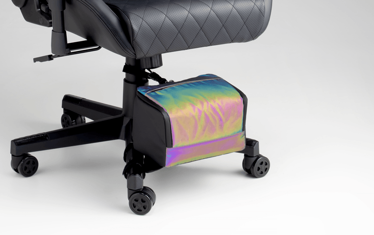 ゲーミングチェアの脚部(座面下)のデッドスペースを活用し、バッグは足元にすっきり収まります。収納が限られるワンルームや集合住宅、タワーマンションなどでもスペースを無駄なく活用できます。キャスター付きチェアなら掃除時もチェアごと移動でき、日常の動線を妨げません。