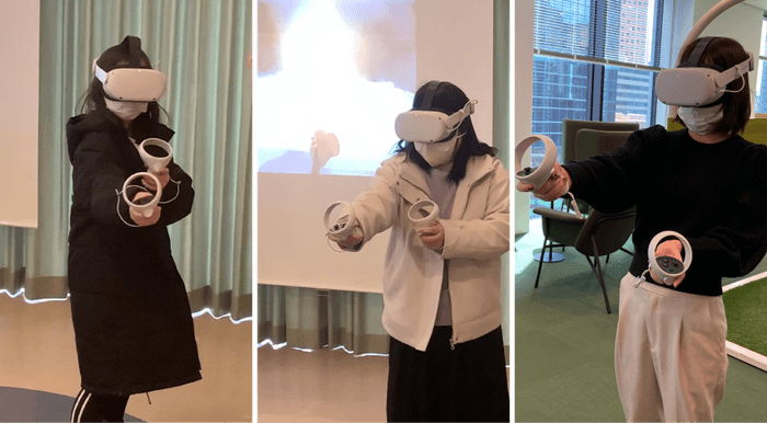 さらに往来の消火訓練で使用されていた水消火器とは異なり、VR内では、消火薬剤が舞い、火の元が狙いにくくなるという現象も再現しており、実践に近い体験がVRでは可能です。