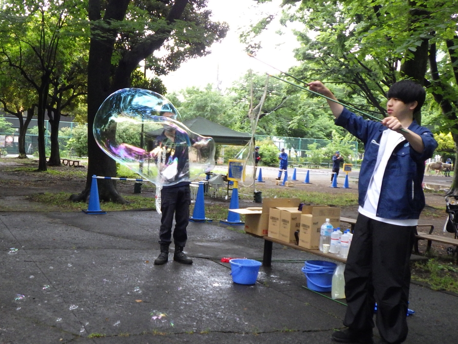 青空の下で、大きなシャボン玉づくりを思いっきりやってみよう!