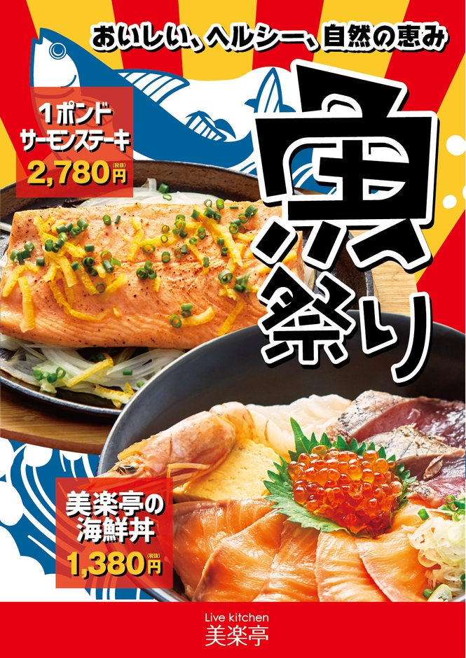 レストラン「美楽亭」の運営会社はホテルや結婚式場を手がけており、旬のこだわり食材を使った料理が自慢のレストラン。スパリゾート内とは思えないような本格的なステーキや定食、麺類、おつまみなど盛り沢山のメニューが楽しめます。今回は季節限定の魚に特化した「魚祭り」を開催。他ではみられない1ポンドサーモンを使ったステーキや、オリジナルの海鮮丼、骨まで食べられる秋刀魚など、何回来ても楽しめるメニュー構成になっています。湯上りやカラダを動かした後に、明るく開放的なレストランでゆっくりと美味しい食事をお楽しみいただけます。