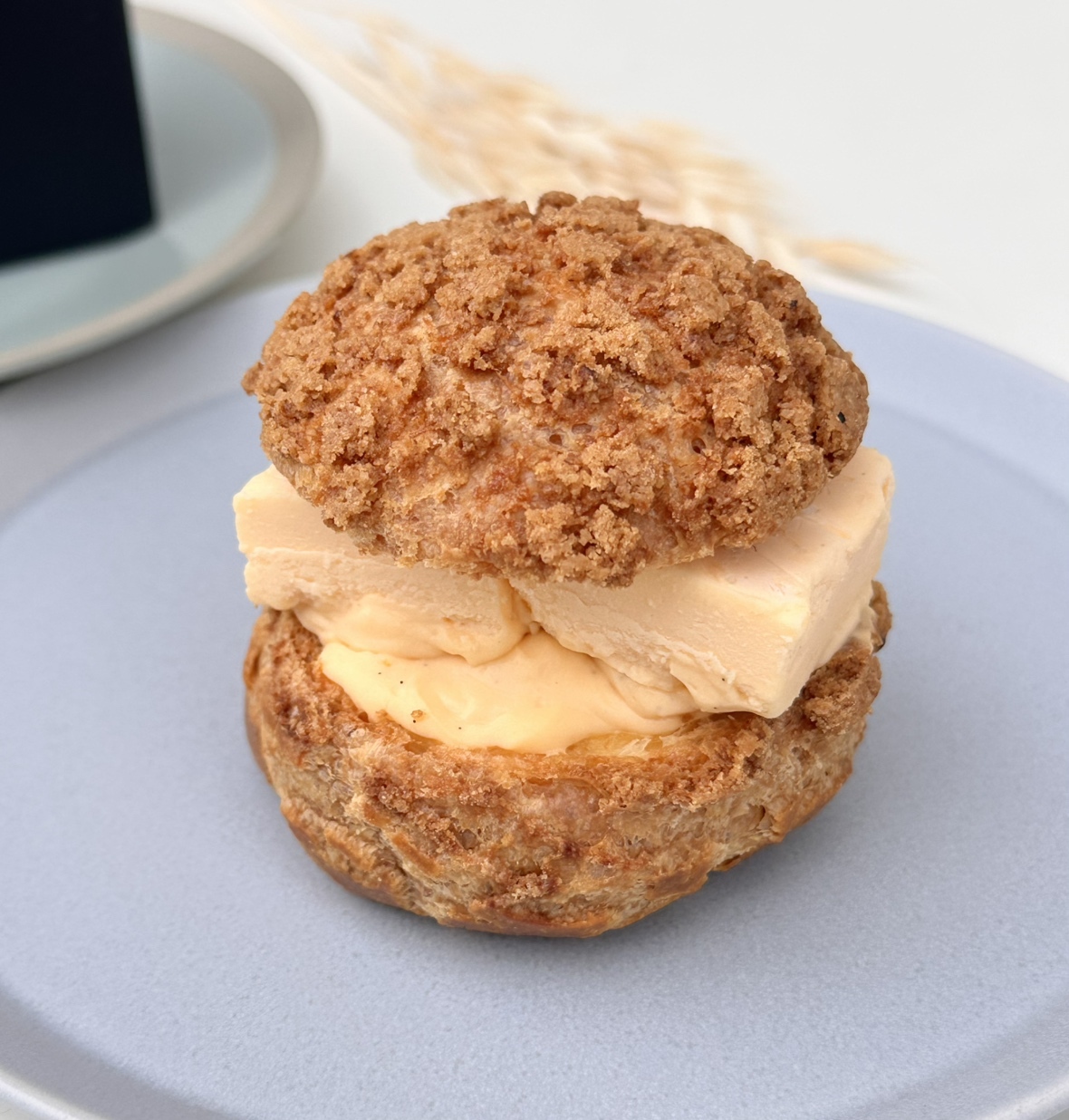 ・極限のサクサク感 :店内の専用オーブンで、表面のクッキー生地を再度加熱。バターの香りが再び目覚め、出来立て以上のカリッとした食感を生み出します。