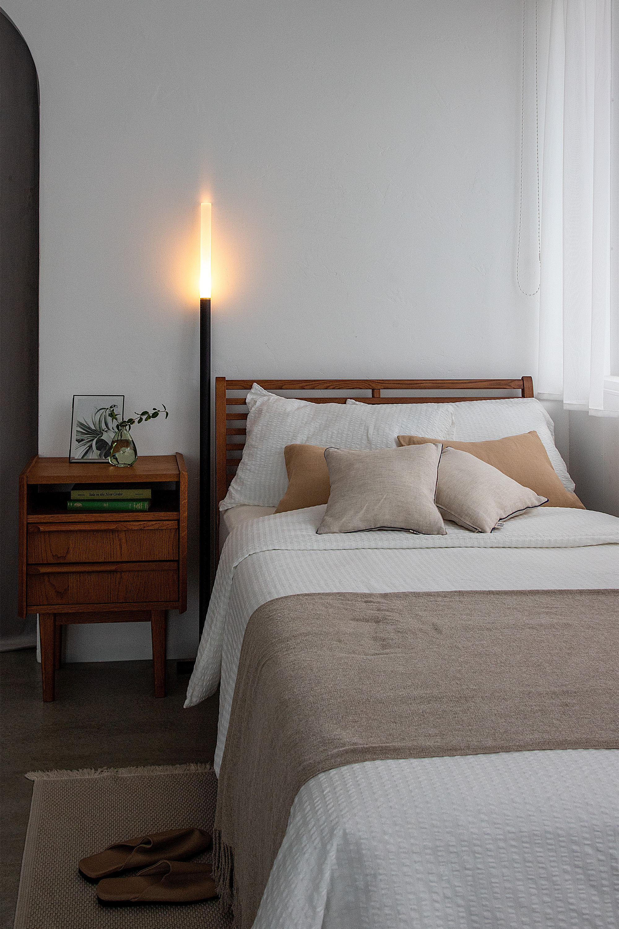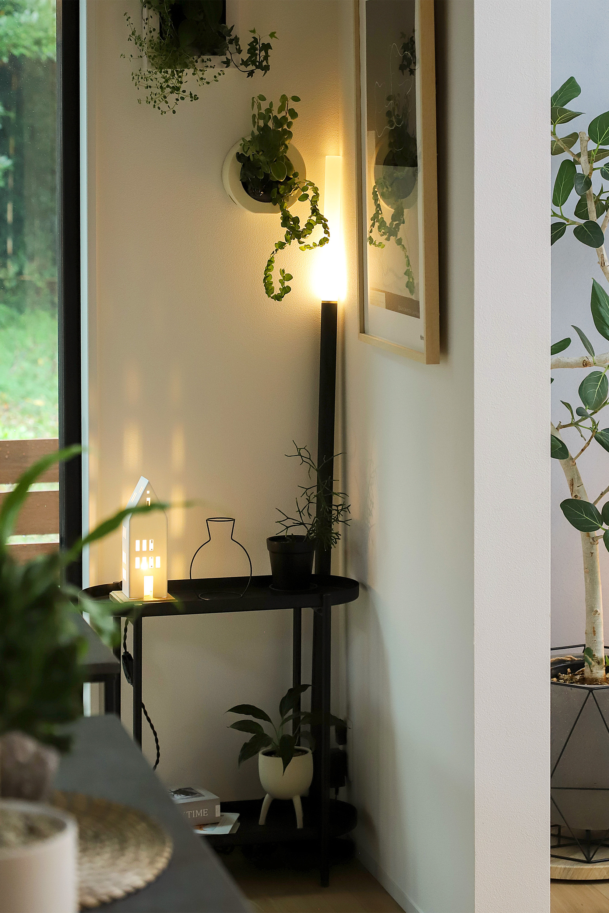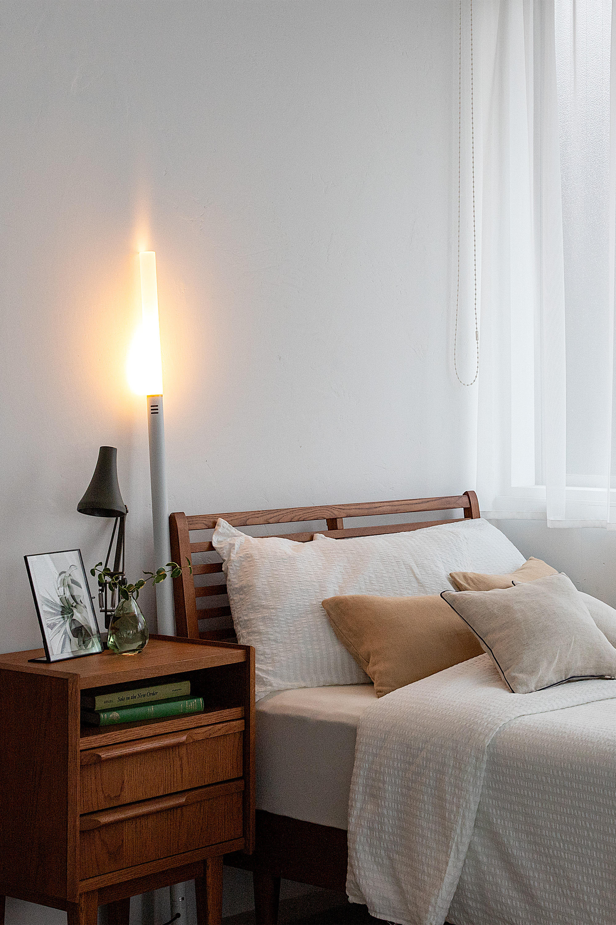 空間を圧迫するランプシェードと重たいベースを思い切って取り払い、壁を新たなシェードとして光をデザイン。