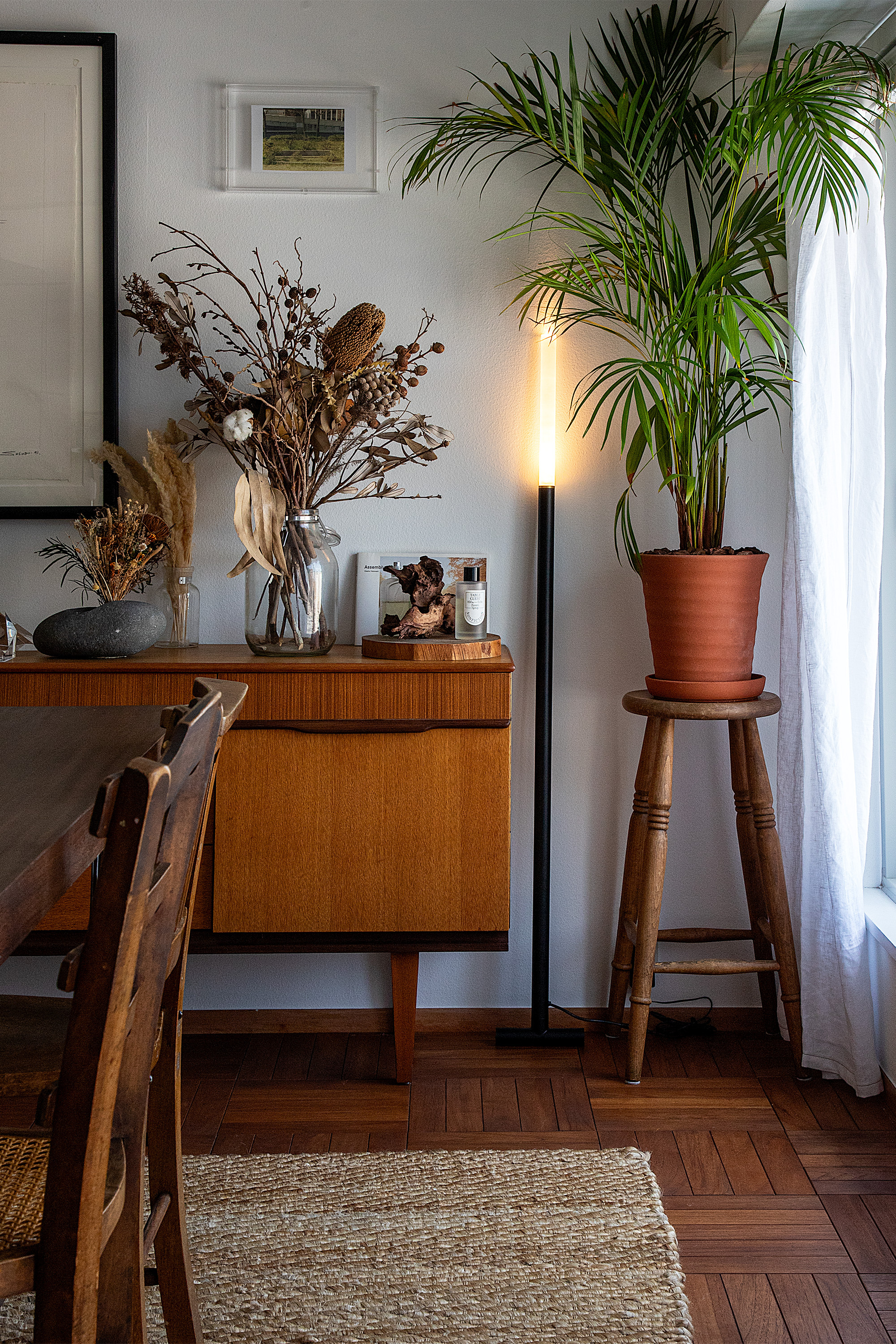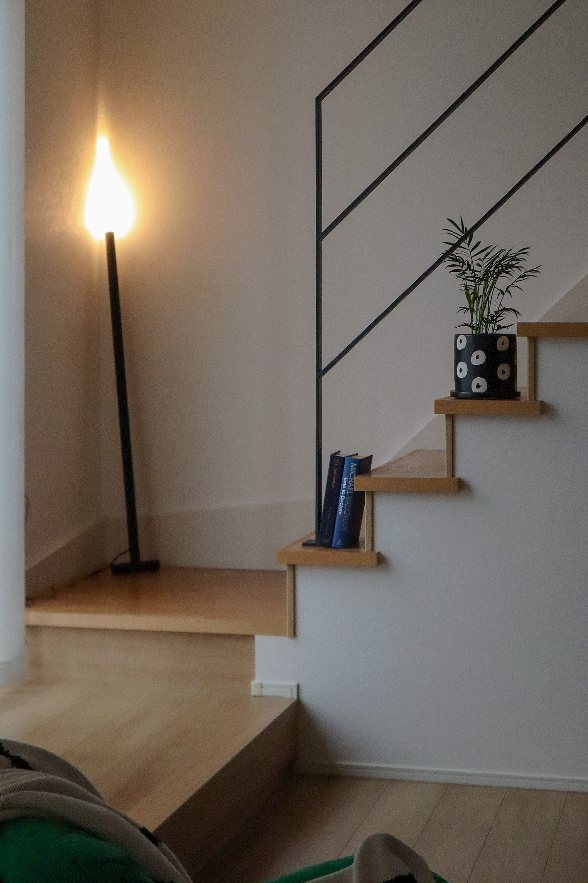 従来のフロアライトは、5~7kgにもなる円盤型のベースによって壁際にぴったりと配置できず、無駄な隙間を生みがちです。