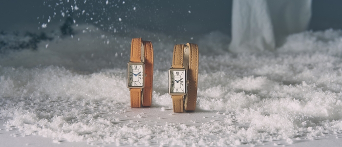 前作「月華」が纏っていたのは、ステンレスバングルの凛とした輝き。今作ではその輝きに、よりしなやかな“流れ”が重なります。手首を静かに2周するレザーストラップが、月光のように腕に沿い、花のように軽やかに美しく、確かな存在感をまとわせます。小ぶりなスクエアケース(29mm×19mm)は同じ佇まいのまま、素材の変化が“新しい表情”を生み出しました。細くしなやかなレザーが二重に重なることで、一本の線では生まれない“奥行き”と“動き”が腕元に生まれ、その重なりが月が描く静かな流れのような優雅さを添えます。柔らかなラインが腕元に自然な広がりを生み、アクセサリーのような軽やかさで日常を彩ります。光と影の調和が生む、月華の世界観。クラシカルなローマ数字、ミニマルなフェイス。それらが二重レザーの質感と重なり合い、“線の美しさ”と“余韻”をより際立たせます。レザーがつくる柔らかな影、ケースが放つ控えめな光。そのコントラストが、ツキコレクションが描いてきた静かな美の世界観をより豊かに広げていきます。