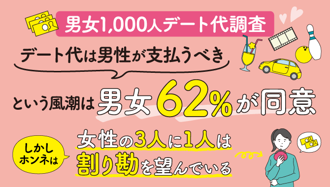 冒頭の意識調査で、「デート代は男性が支払うべき」という風潮に対して、「同意する」もしくは「ある程度は同意する」と回答したのは、男女ともに62%でした。