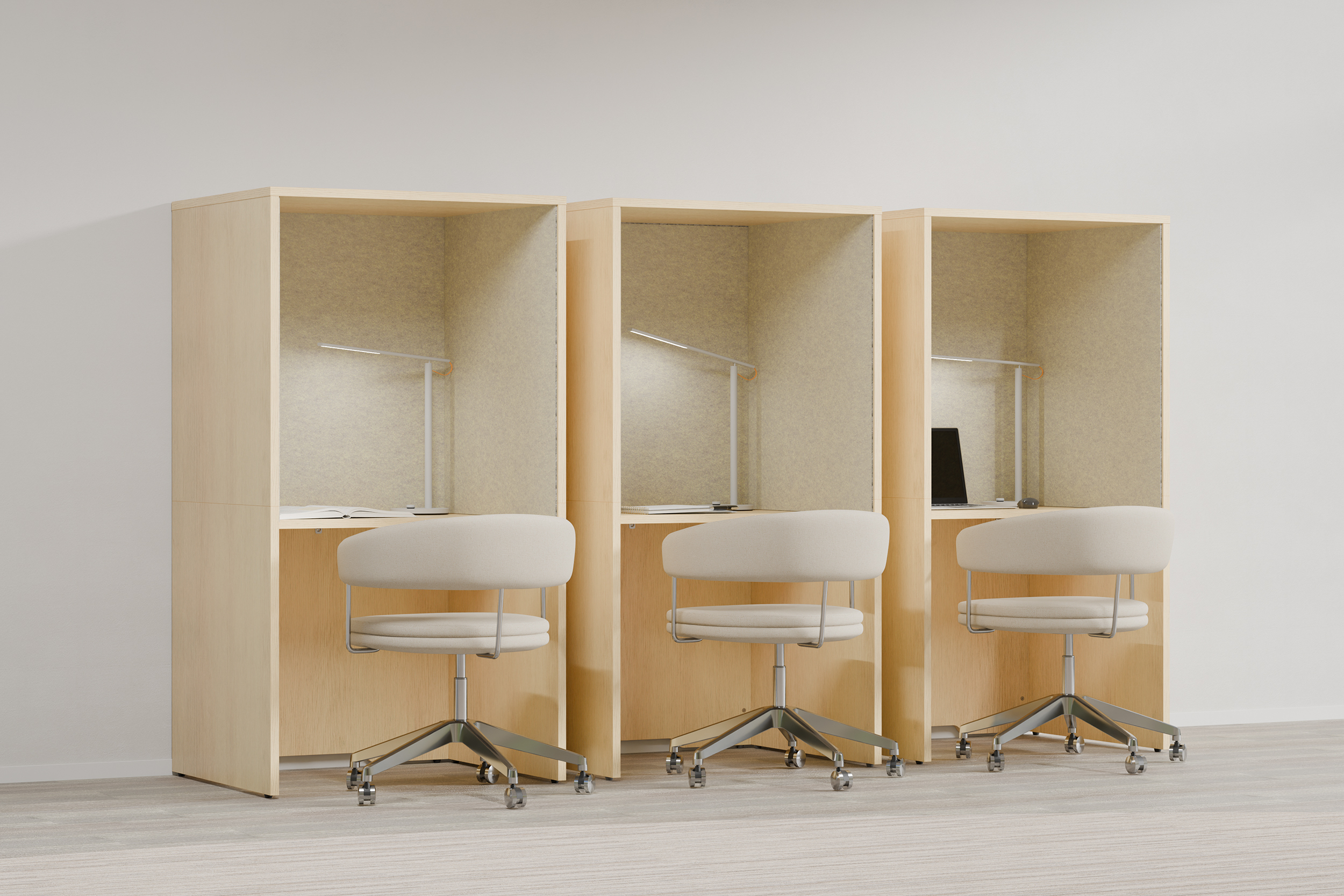 BOXデスクは、オフィス内でのWeb会議や集中作業に最適な半個室型ワークスペースです。内装には高性能吸音材を採用し、音を効率的に吸収。BOXデスク専用に設計された素材により、正面・横方向で-15dB以上の防音効果を発揮します。複数台の設置でさらに効果が高まり、周囲の雑音を気にせず作業に集中できます。