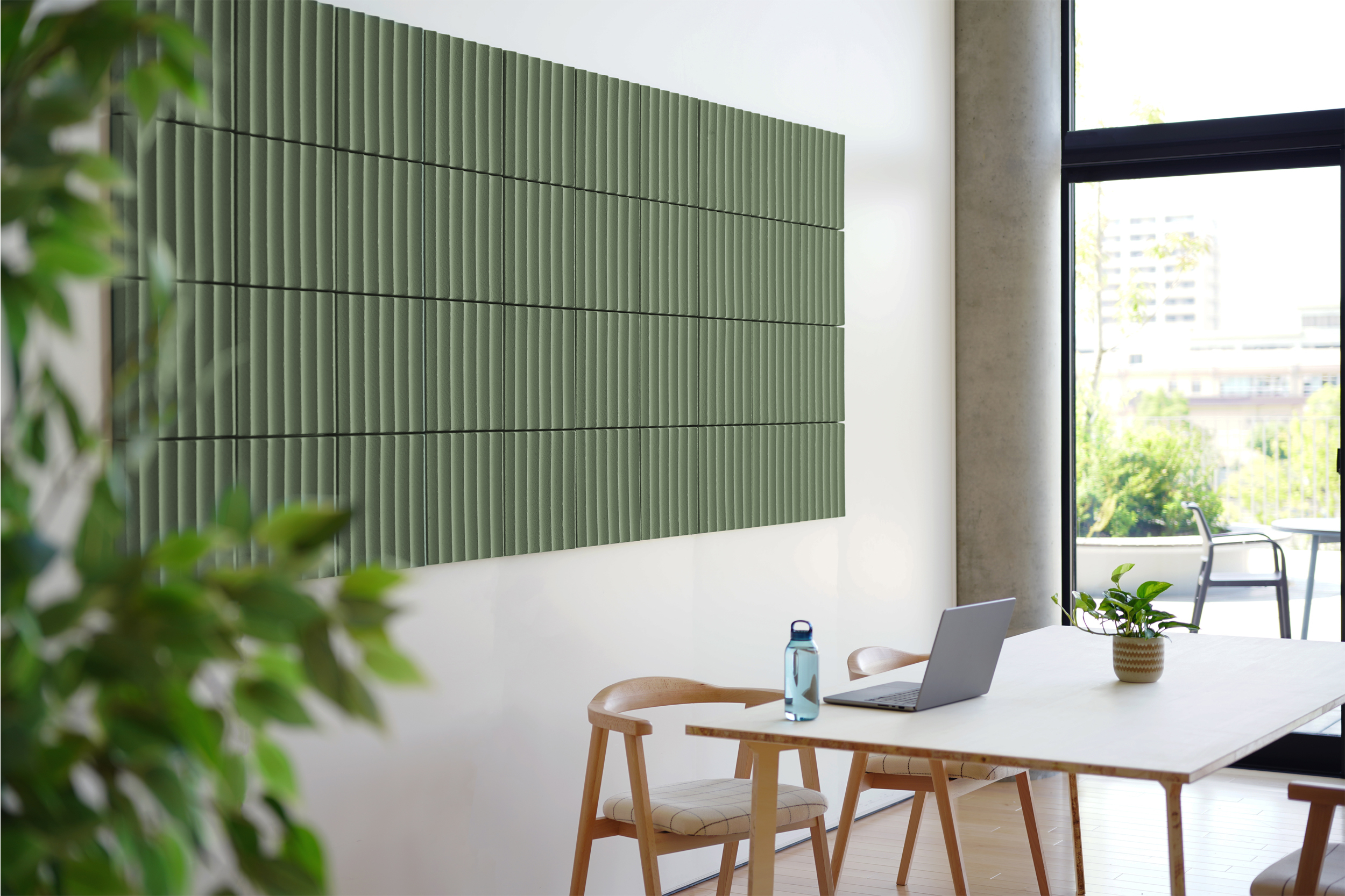 オフィスや会議室などの反響音を抑え、快適な音環境を実現する吸音パネルです。合成樹脂や化学接着剤を一切使用せず、古紙パルプ100%で構成。廃棄時には土に還る環境負荷の少ない設計で、脱プラスチック時代に対応したサステナブルな製品です。日本の伝統色を採用した波型デザインが、空間に落ち着きと美しさをもたらします。環境負荷に優しい素材での製品開発と、幅広い周波数に対応できる高い吸音性能の実現を両立させた点が評価され、2025年度グッドデザイン賞を受賞いたしました。