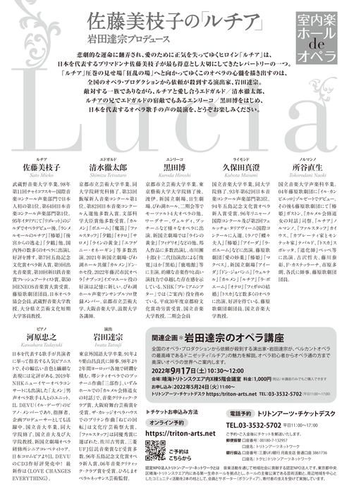 認定NPO法人トリトン・アーツ・ネットワーク(東京都中央区、理事⻑:⻑浜⼒雄)主催、『<ウィークエンドコンサート>室内楽ホールdeオペラ~岩田達宗プロデュース~佐藤美枝子の「ルチア」』が2022年10月22日 (土)に第一生命ホール(東京都中央区)にて上演されます。チケットはカンフェティ(運営:ロングランプランニング株式会社、東京都新宿区、代表取締役:榑松 大剛)、主催者チケットデスクほかにて5月24日(火)より発売開始いたしました。
