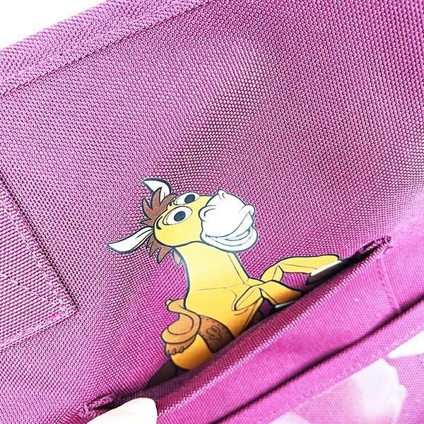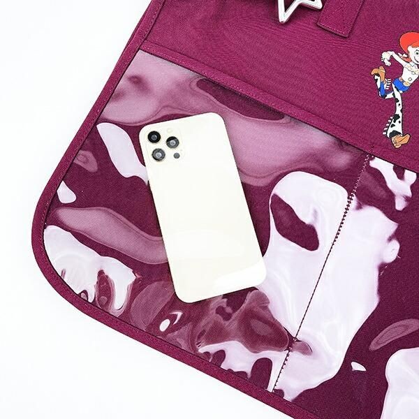 こちらがアコモデ×トイストーリーのマルチポケットトートバッグです。ジェシーとブルズアイのデザインはおしゃれなワインレッドカラーとなっております。これまでにもトイストーリーとアコモデの素敵なコラボアイテムをたくさんご紹介してきましたが、今回もめちゃくちゃおしゃれ可愛いデザインにキュンです!
