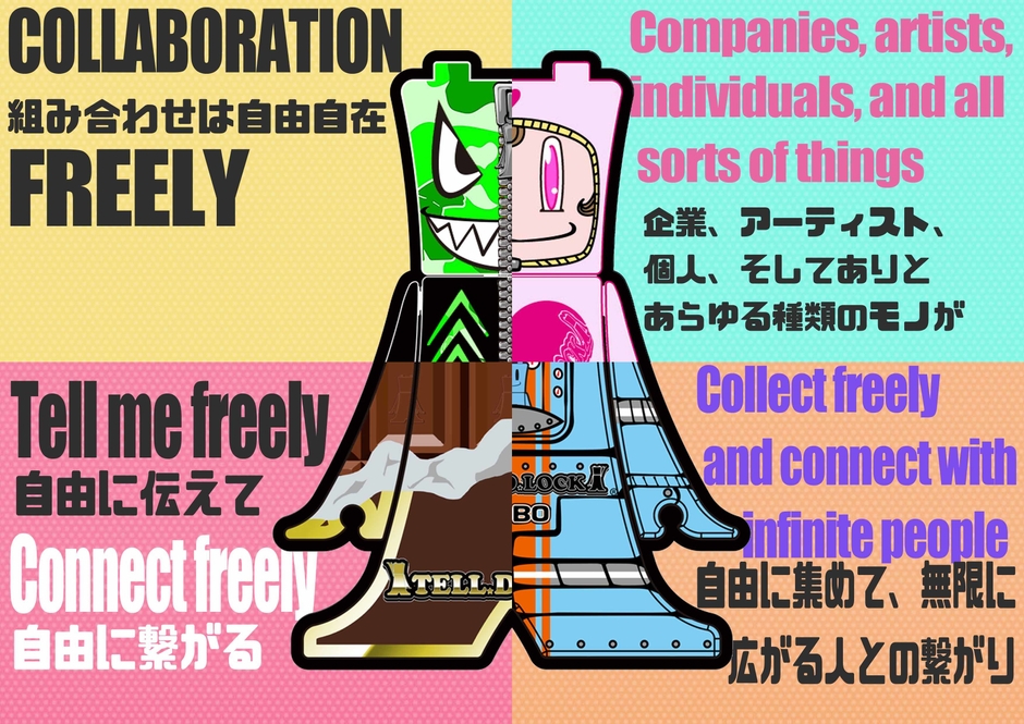 個人や企業、artistブランドやスポーツ、音楽、グラフィックやメッセージといったありとあらゆるものがTELL.D.LOCKにデザインされ、このブロック型フィギュアが物理的に合体(セルフコラボ)を行います!TELL.D.LOCKの数、伝えたい想いの分だけ無限に繋がることが魅力です!