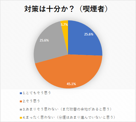 さらに、「オフィスや飲食店の分煙対策は十分だと感じるか?」という質問を行なったところ、喫煙者と非喫煙者で大きく意見が分かれました。やはりというべきか、喫煙者より非喫煙者のほうが厳しい意見が多く見受けられます。
