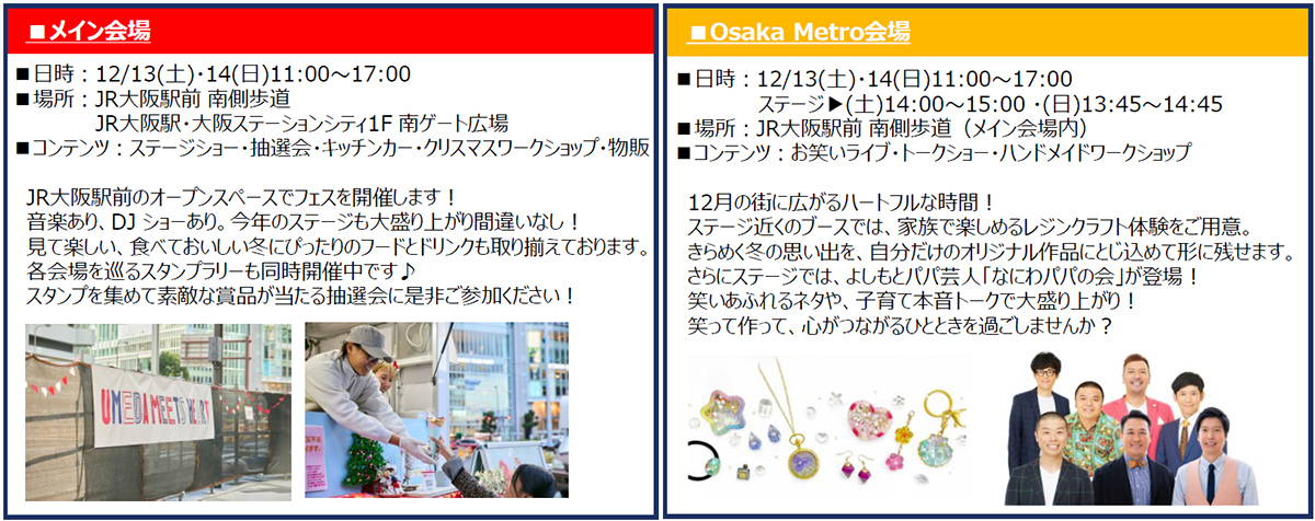 メインコンテンツとなる「HEART FES」は公共空間を中心に梅田の5つのエリアで12月13日(土)~12月14日(日)の2日間で開催します。クリスマスコンサートやワークショップ、マーチングパフォーマンスなど、まち歩きをより楽しんでいただけるコンテンツを多数ご用意しました。