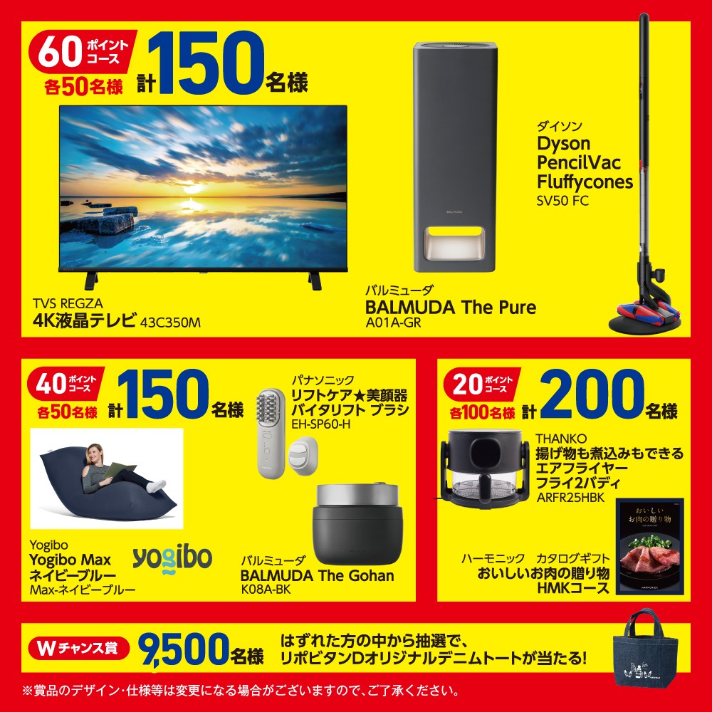 「ファイト イッパーツ! 応援キャンペーン2025冬」は、リポビタンDおよびリポビタンブランド製品をご愛顧にいただいている皆さまに感謝の気持ちを込めて実施する年末年始恒例のキャンペーンです。対象製品についている応募シールを集めてご応募いただくと、ポイント数に応じて、抽選で43V型4K液晶テレビや空気清浄機のBALMUDA The Pure(いずれも60ポイントコース)などの素敵な賞品が合計10,000名様※1に当たります。
