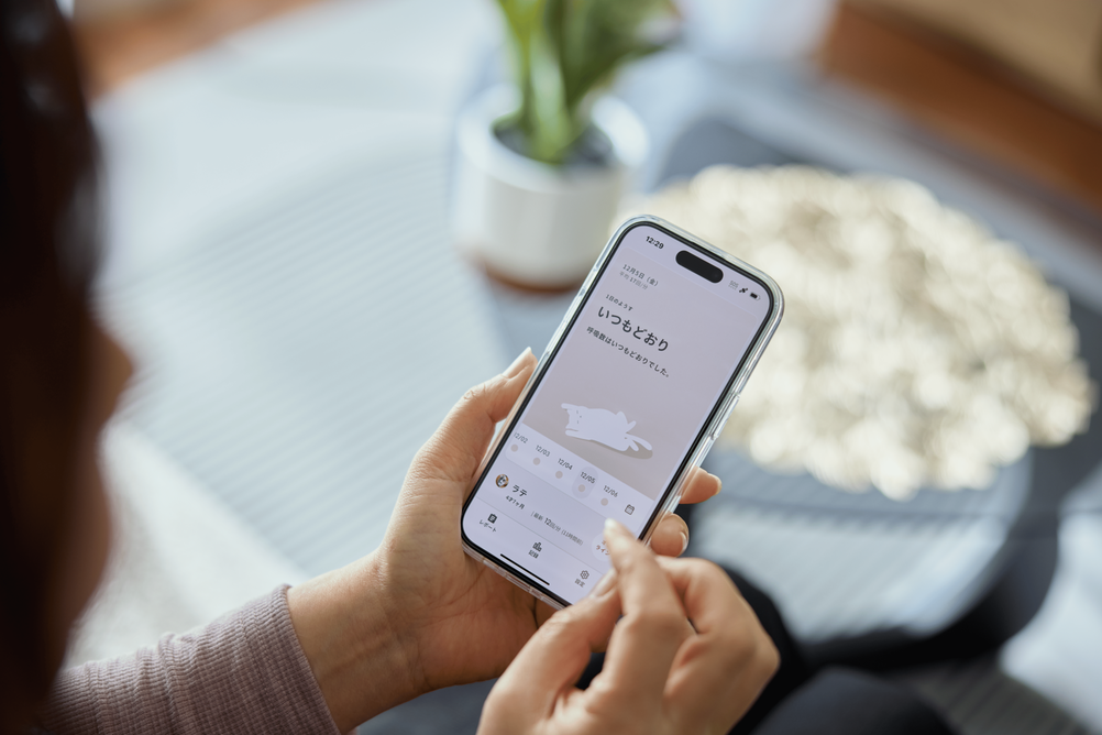 計測した呼吸数は専用アプリで確認でき、毎日「いつもどおり」かどうかを通知してくれます。猫ごとに個体差のある呼吸数を「いつもの呼吸数」として毎月算出し、日々の変化をわかりやすく伝えるため、体調の小さな変化にも気づきやすくなっています。