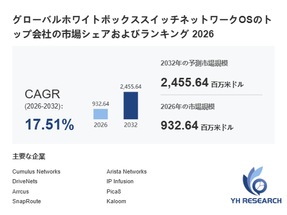 YHResearch調査チームの最新レポート「グローバルホワイトボックススイッチネットワークOSのトップ会社の市場シェアおよびランキング 2026」によると、世界のホワイトボックススイッチネットワークOS市場は2025年に781.86百万米ドル規模に達すると予測され、2026年には932.64百万米ドルに拡大する見込みです。2032年までに2455.64百万ドルに達すると予測されており、2026年から2032年までの期間における年平均成長率(CAGR)は17.51%と予想されています。